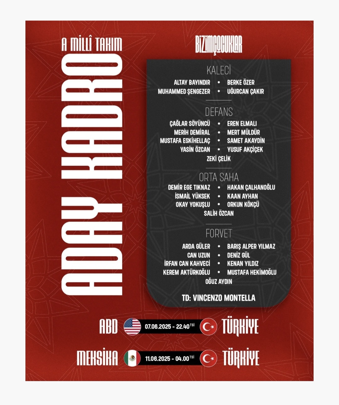 Teknik Direktör Vincenzo Montella’nın aday kadrosunda şu isimler yer alıyor: