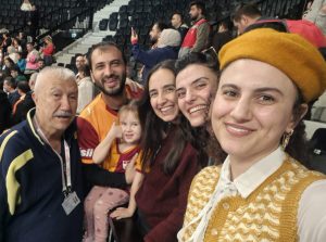 Tribündeki güzellik. Sarı-kırmızı formalı baba ve güzel kızı, anneleri yanında. Ve Eczacıbaşılı güzel kızlar. Saatimdeki Atatürk’ü görünce, selfi çekelim istediler. Bu güzelliğe “hayır” denilebilinir mi.